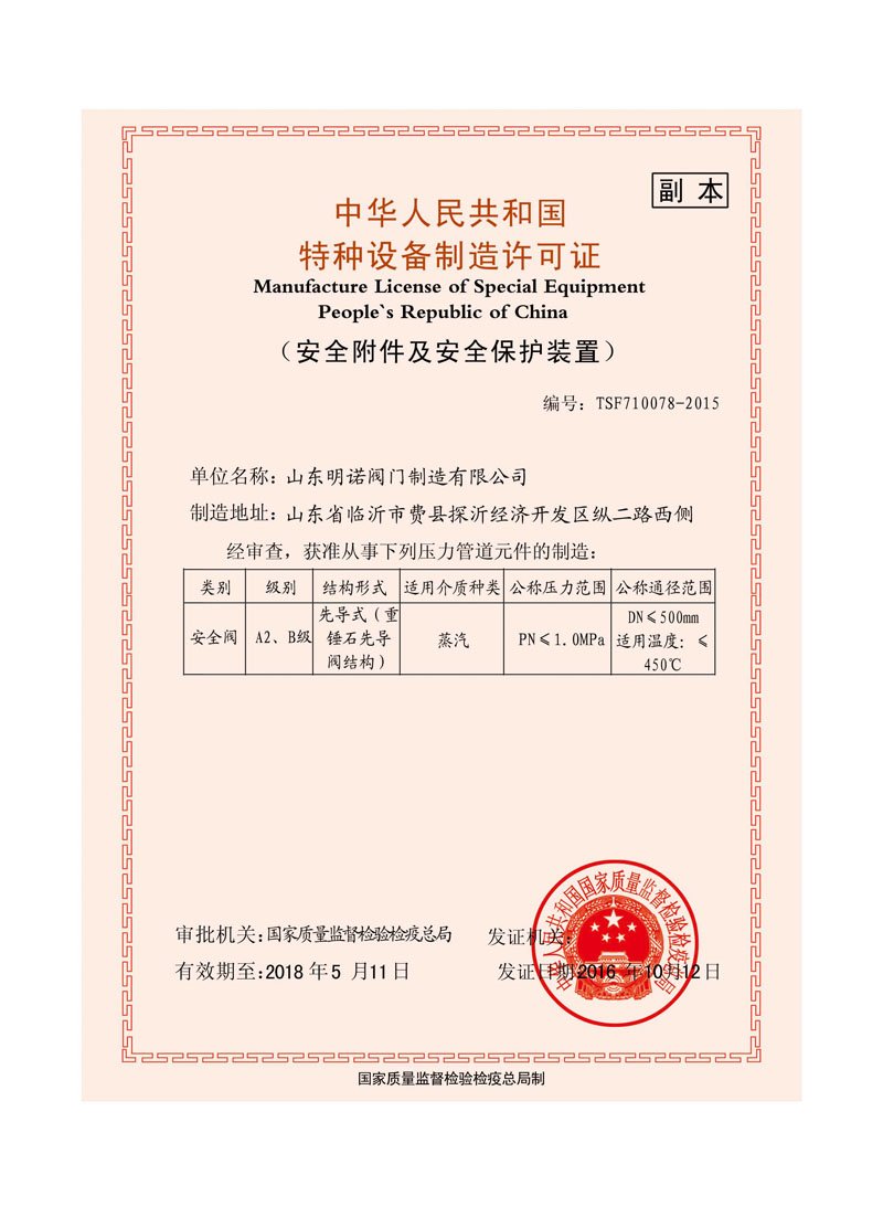特種設備制造(zào)許可證(安全附件(jian)及安全保護裝置(zhi))